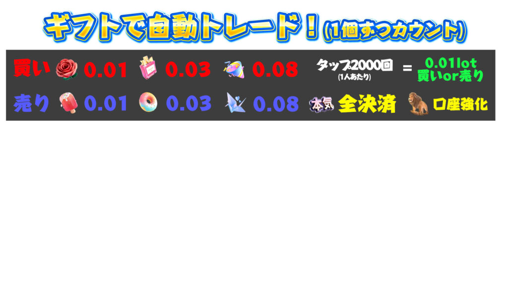 従来のような決まった形でトレードするのではなく、実際に人が判断してギフトを投げるので、柔軟性が高くどんな相場にも対応しやすい。