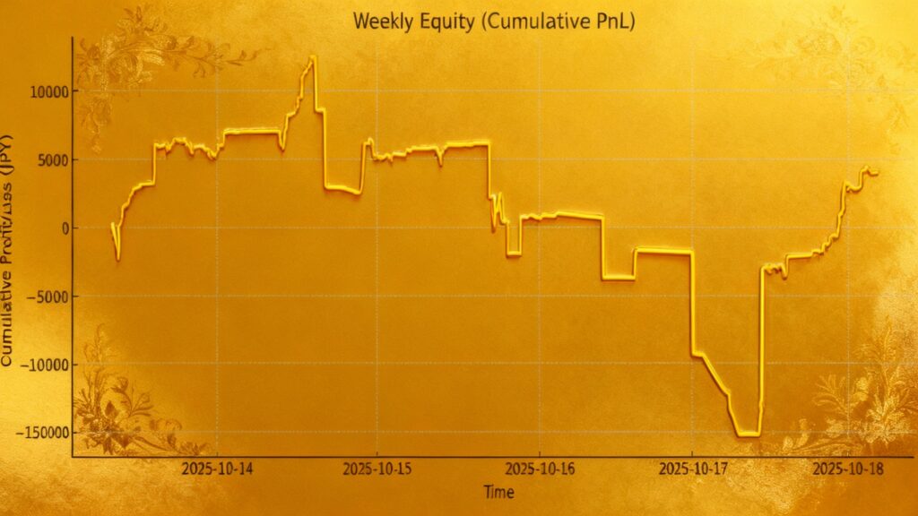 ② ゴールド(XAUUSD)での総合利益はプラスで維持欧州で大崩れした日があったにも関わらず、週トータルで金スポットは+38,117円のプラス。エントリー方向は合っている日が多く、戦略自体は間違っていない。