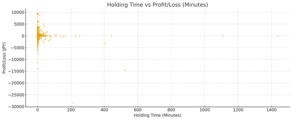 ⑤ 保有時間が120分を超えるポジはほぼ全て損失「含み損耐えて放置」が損失の95%以上。→ “30分以上含み損なら必ず損切り”ルールを機械的に導入すべき。