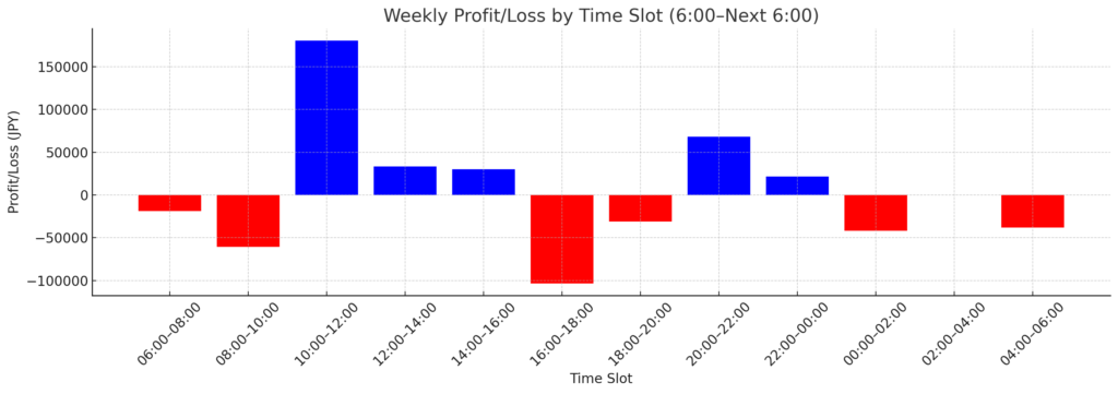 ① 午前10時~14時の勝率・損益が安定してプラスこの時間帯(東京後場〜欧州前)は毎日安定して利益が出ている。特に10〜12時の合計利益は週トータルでも最大。「得意時間帯=午前中」 は明確な強み。